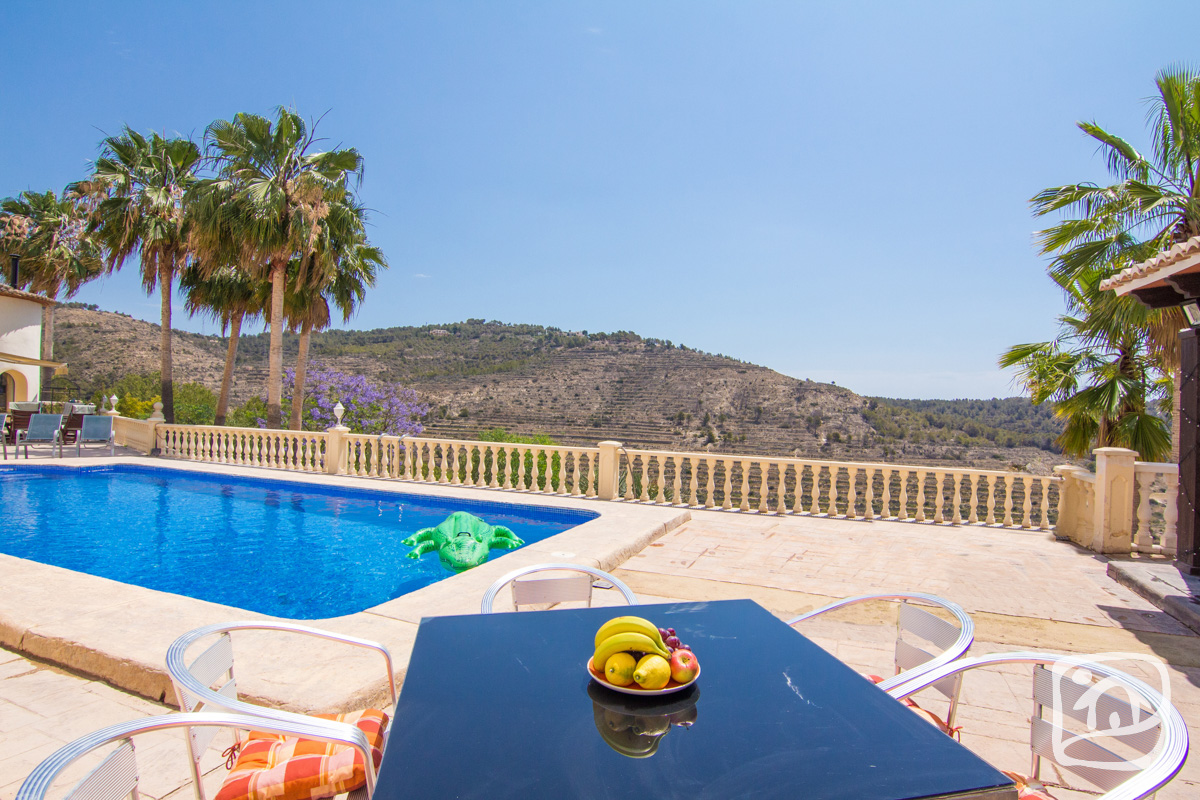 BEAUTIFUL VILLA FOR RENT IN CALPE (COSTA BLANCA), WITH PRIVATE POOL, for up to 8 people. LAY OUT: This lovely villa of 280m2 is distributed on two floors and is connected by an internal staircase. Upstairs we have three double bedrooms and two bathrooms (one with shower en suite and one with shower and bath). Finally there is a large terrace overlooking the Natural Park of Penon de Ifach and the Mediterranean Sea. On the ground floor there is a double bedroom, a shower room and guest toilet. There is a fully equipped kitchen with American refrigerator and kitchen island and two beautiful and comfortable lounges and a dining room. EXTERIOR: The villa is built on a plot of 2050m2. It has a large pool located on a terrace overlooking the Rock of Ifach and the blue sea. On this terrace there is a covered area with a place to relax with comfortable furniture, pool table, ping pong and an extra fridge. Access the plot through manual gate where there is enough space to park the vehicles. LOCATION: This lovely villa is located in a residential area of Calpe, 10 min from the village and its magnificent sandy beaches. OTHER: FREE WIFI INTERNET. AIR CONDITIONING IN THREE BEDROOMS. PING PONG. POOL TABLE. PETS NOT ALLOWED.