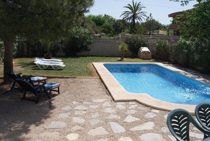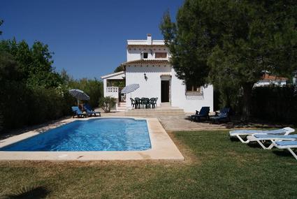 Villa de alquiler en Denia. Villa Montenegro se caracteriza por su situación, a escasos 130m. de la playa de arena. Se trata de una villa sencilla con una situación inmejorable si lo que se desea es disfrutar de las amplias y tranquilas playas de arena. La villa dispone de parking, gran terraza acristalada, jardín con césped, grava, plantas y árboles, piscina privada 8x4m rectangular con escalera de obra, barbacoa, mobiliario de jardín…el interior consta de salón comedor con T.V., cocina, 4 dormitorios, 1 baño con ducha, otra con bañera y 1 w.c.