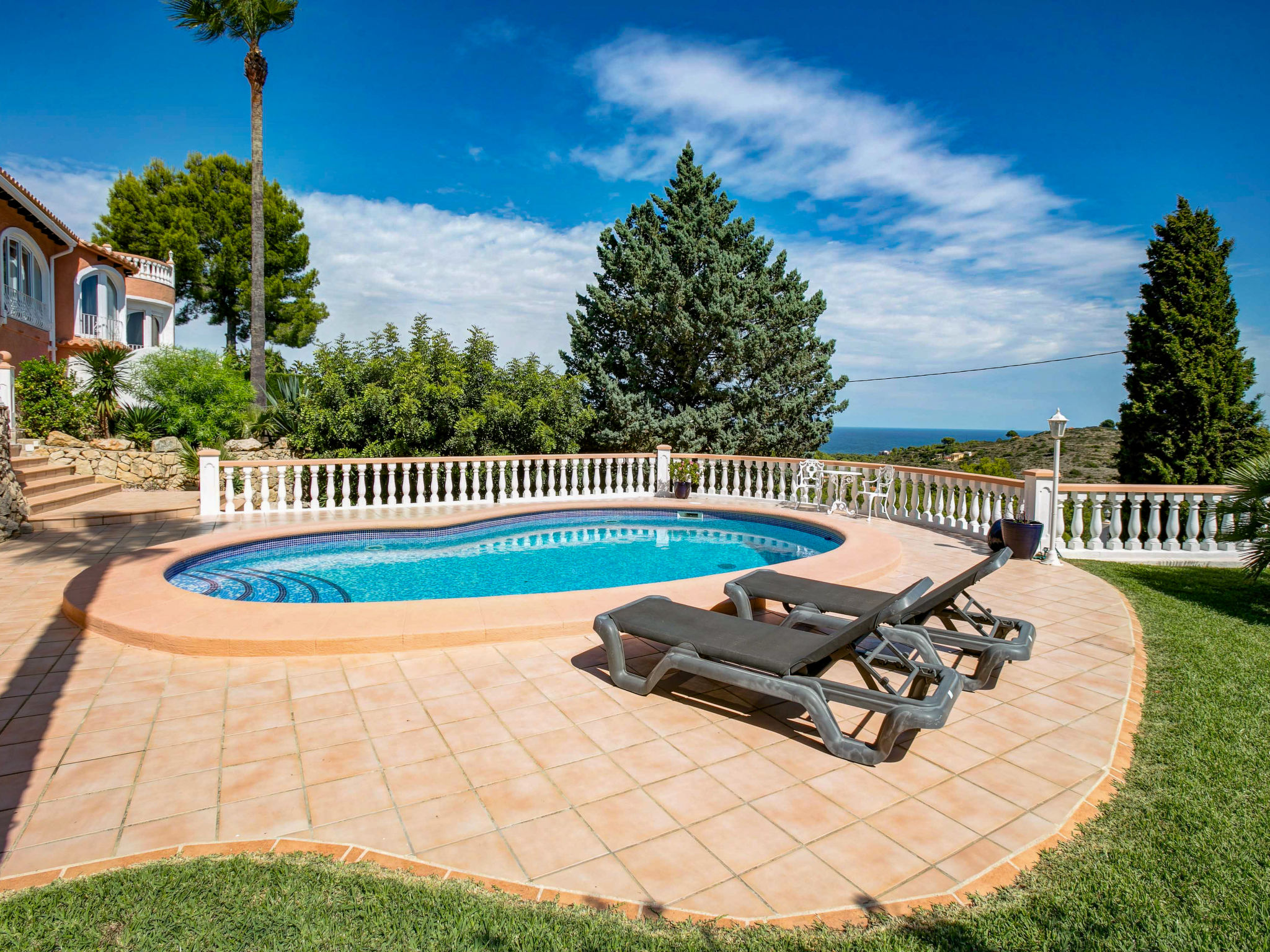 Partida Florida a 5 km de Dénia: Casa "Villa Summer", muy amplia, muy agradable, muy confortable de 2 plantas, rodeada de árboles. En el barrio de La Florida, lugar tranquilo, elevado area residencial (villas), zona con poco tráfico, a 100 m de un bosque, a 4 km del mar, a 4 km de la playa, en una calle sin salida, orientación noreste. Privado: jardín en diferentes niveles grande (vallado) con plantas y árboles, piscina en forma de riñon (4 x 8 m, 80 - 210 cm de profundidad, 01.01.-31.12.) con escalera interior. Ducha exterior, muebles de jardín, barbacoa, caseta de barbacoa.