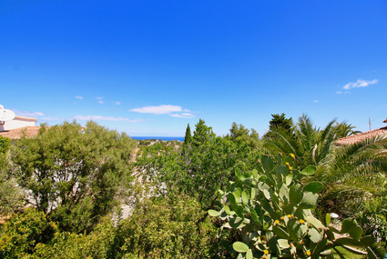 Casa vacacional junto a la montaña de Dénia con bonitas vistas panorámicas a la ciudad, el puerto y el mar. El jardín consta de palmeras, cactus y demás plantas variadas. Del aparcamiento cubierto se llega a través de algunos escalones a la entrada principal de la casa, con un salón-comedor con TV y aire acondicionado en todo el alojamiento. Hay dos dormitorios dobles con aire acondicionado.