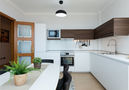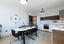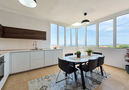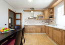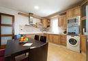 Cocina con 3 quemadores, microondas, horno, grill, mesa de comedor, rincón comedor, lavavajillas, frigorifico y congelador.
