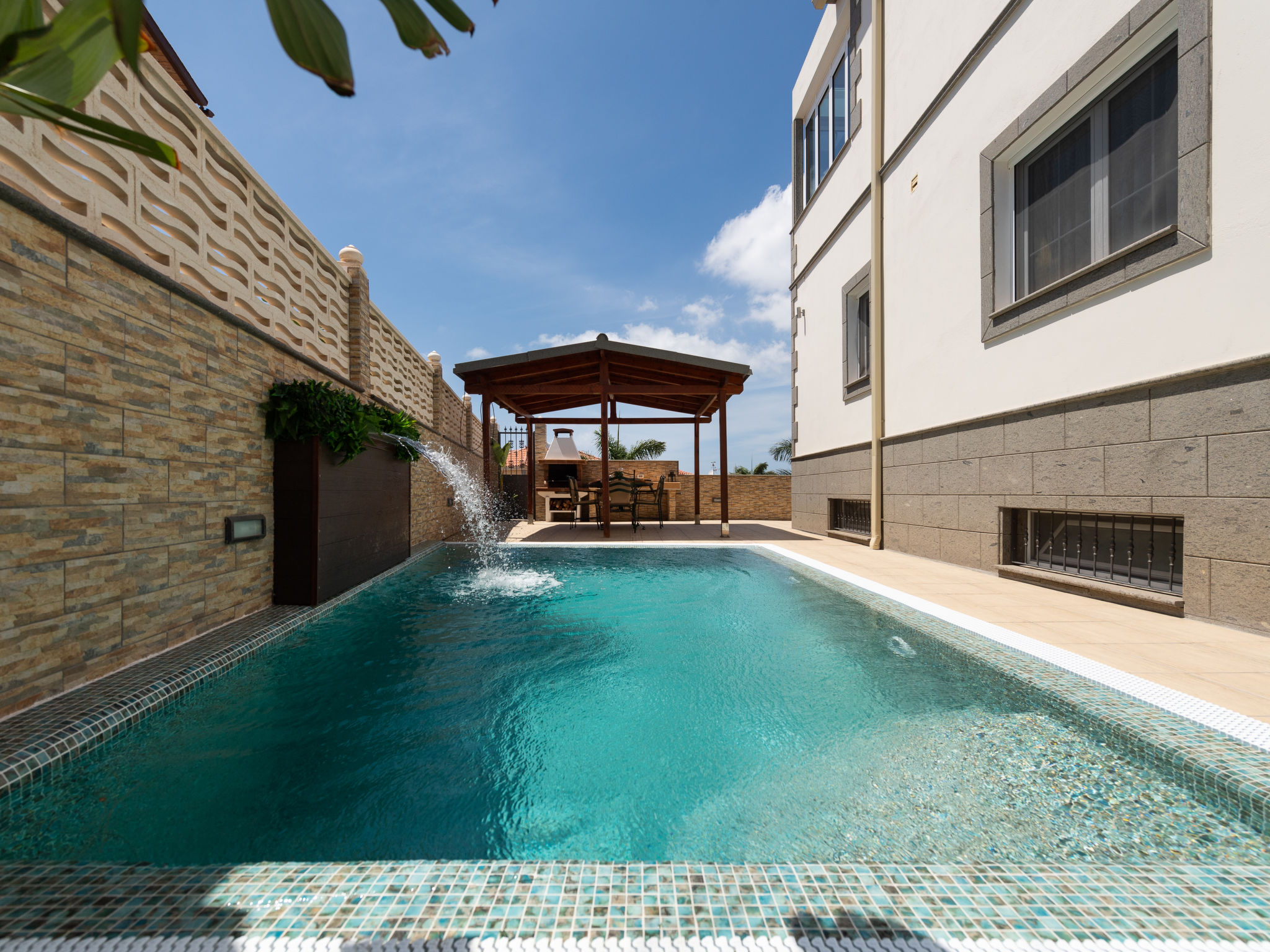 Villa, amplia, moderna "VILLA MELONERAS". Equipamiento de la vivienda: aire acondicionado, lavadora (privado). Parking: parking al lado de la vivienda. Acceso en coche todo el año. Situación: lugar soleado. Vista desde la vivienda al mar y a las montañas. Entorno de la vivienda: terreno (privado, 400 m2, vallado), piscina (privado, climatizada, longitud 7 m x ancho 3 m), ducha exterior (privado), barbacoa (privado). Infraestructura y distancias: tienda 550 m, tienda de comestibles 550 m, supermercado 550 m, restaurante 3 km, playa de piedras 3.5 km, playa de arena 3.5 km, campo de golf 2 km, tenis 4 km. A tener en cuenta, en las proximidades hay una autopista a 1 km, una calle principal a 1 km y un aeropuerto a 37.5 km. La climatización del jacuzzi está condicionado a la climatización de la piscina, van de la mano.Disponibilidad