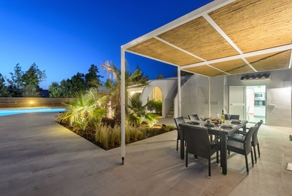 Zona de piscina agradable con bonita iluminación nocturna, zona de bar, mesa para 8 comensales, tumbonas y parasoles, ducha exterior, barbacoa de construcción. La piscina es de agua salada.