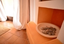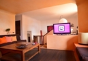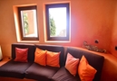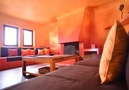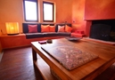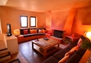 Salón con chimenea y altillo con TV y DVD. Acceso a una terraza cubierta con salón exterior.